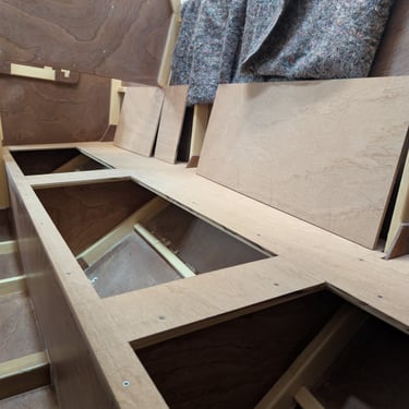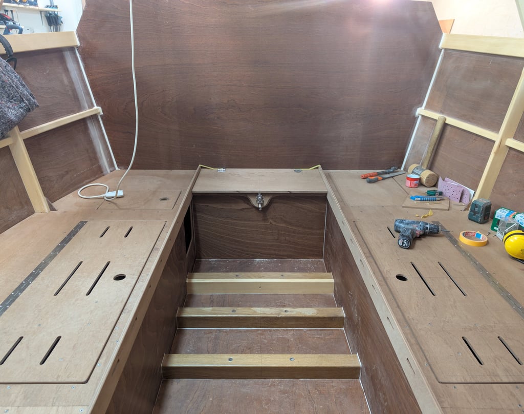 Use thicker plywood (10–12 mm) for bunk tops and hatch lids to reduce flex and simplify construction.