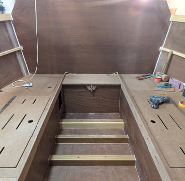 The hatch lids themselves turned out to be far more work than expected. From starting this project to having everything installed took close to four months, although other jobs—like filleting the interior and coating—were happening in parallel. Still, the method I chose for the access hatches was very labour-intensive. Using 8 mm ply meant adding extra braces on the underside to keep the lids straight and properly supported. While the result works, it’s definitely an area where I’d rethink the approach if I were starting again.