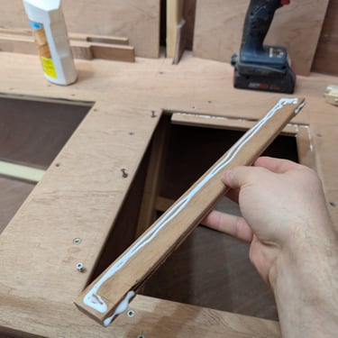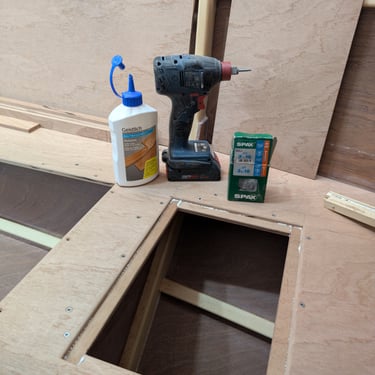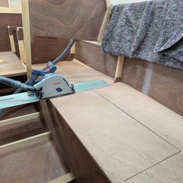 After templating, I cut the bunk tops from 8 mm plywood. In hindsight, I would recommend using at least 10 mm ply here, as it is more stable and gives more leeway for mounting hardware. I then cut out the access hatches using a plunge saw, finishing the corners with a jigsaw. Internal doublers were added so the lids had something solid to rest on. For these interior parts, I used D3 wood glue instead of epoxy. Strength-wise it is comparable, cold-water proof, and perfectly suitable for interior use. The main limitations are that it is not gap-filling and requires good clamping pressure—but for this application, it worked well and was easier to handle.