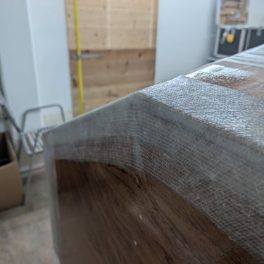I finished off the lamination with a layer of peel-ply which was a lot harder to lay down than the actual glass fabric. I was pretty happy with the results. Almost no air bubbles trapped, and a nicely saturated glass laminate which even at 5 layers was pretty much see-through. During the hardening process the fabric pulled together a bit or at leas the peel ply did and left me with some minor wrinkles/pockets of resin on top. This is not a big problem but they will have to be addressed with a sander down the line.