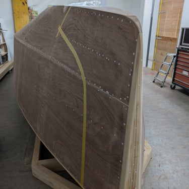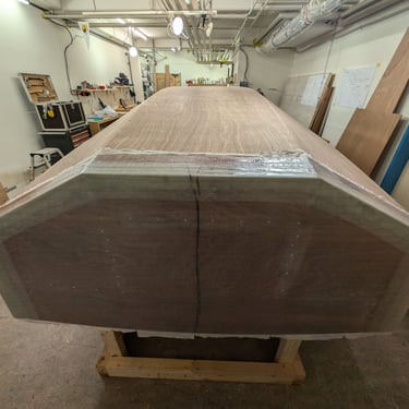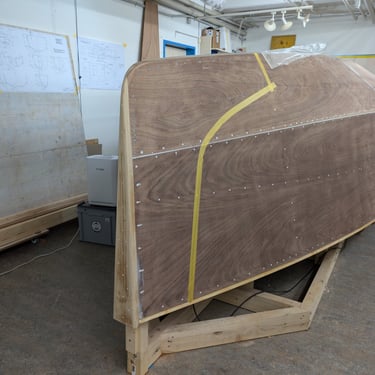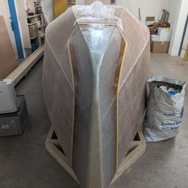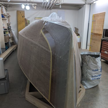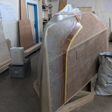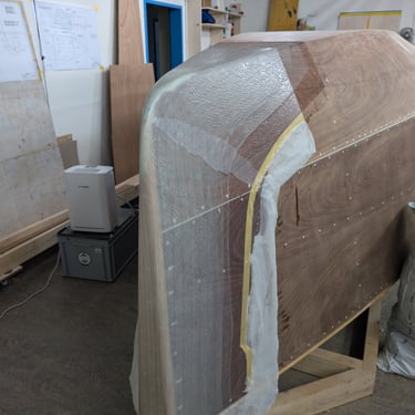 The bow was a bit trickier to do because of the harsh curve of the bow-round. I used five layers of the 280g twill also overlapping by roughly 2.5 cm each. I was able to work the fabric around the bow by compacting into the bow-round (so no cutting). The five layers come out to 1400g/m^2 which is exactly what the laminate schedule calls for at the strongest parts (transom & bottom chine at 2x600g + 1x200g).