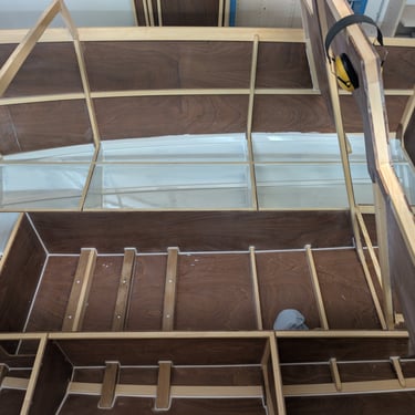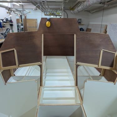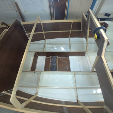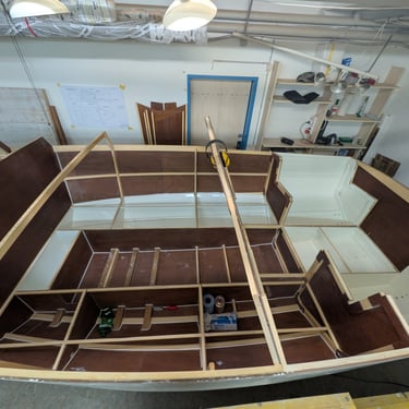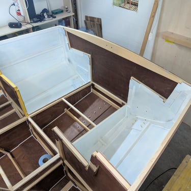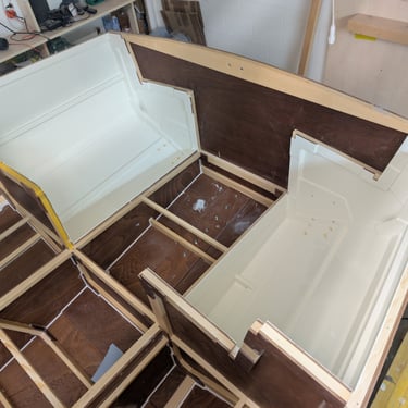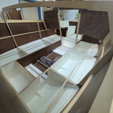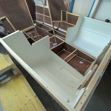 Painting is always a big step, simply because it brings a lot of gratification after seeing such a visually large change. For ease of access I installed the entire interior structure, pre-built the bunk tops and cockpit plating, and then painted all the parts that will not be accessible later. I started with the aft compartment behind frame A, which will become a huge aft locker. I divided it into three compartments, all draining to the centre. This is a small change to the plans that many builders have done to prevent things falling under the floor and becoming unreachable, and also to provide more stiffness to the cockpit floor and structure. For me this means I will need to build an access hatch in the cockpit floor. The painting always follows the same method: preparation is key. All surfaces need to be evenly sanded, first with 120 grit and then with 180 grit. Most parts were pre-sanded before installation, so there was mainly touch-up work, but I still spent days preparing the interior structure and aft locker. I chose to paint everything inside the boat with two-component polyurethane paint, the same as on the topsides. It is the most durable solution: UV-resistant, extremely hard, very scratch-resistant, and even resistant to acids, thinners and fuels for some time. It is also the most expensive and the most difficult to apply. I chose it because the boat has so many hidden corners and sealed compartments, and unlike older boat construction they do not all drain into a central bilge. In a plywood boat a perfect seal and high-quality finish are key to longevity. In the end the system will be three layers of West epoxy, sanded to 180 grit, followed by three layers of Epifanes polyurethane paint, all applied with roller and brush. Before painting, every surface is vacuumed, wiped with a cloth, then with acetone and finally with paint thinner.