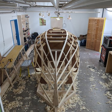 Frames beveled, stringers planed. DriftingDonkey getting ready for hull plating