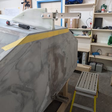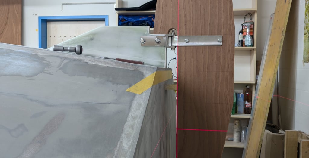 The next step, after provisionally installing the skeg, was figuring out the exact placement of the rudder and the holes for the rudder fittings. I wanted to do this now because I wouldn’t have another opportunity later without lifting the boat. Plus, I wanted to continue working on the rudder with my approach of gluing fiberglass tubing into all the critical holes. I mounted the rudder, using the construction waterline as a reference for where the rudder should sit and deciding on the distance from the stern. I made a slight adjustment to the cutout for the bolt, cutting it about 5mm deeper to provide enough clearance. This adjustment was likely due to the stern lamination and fairing, which resulted in the skeg sitting a bit lower or higher at the aft end, depending on how you look at it. Once I was satisfied with the alignment, I marked the holes and drilled them in both the rudder and the boat.