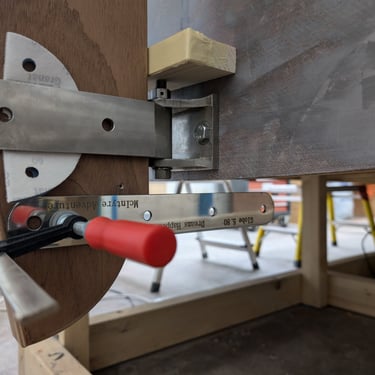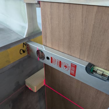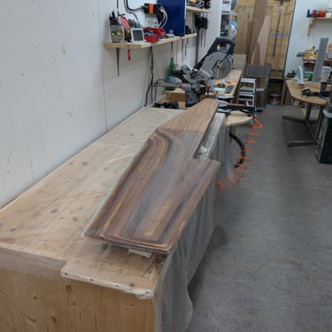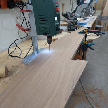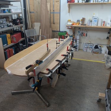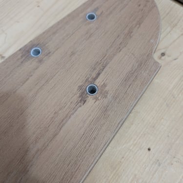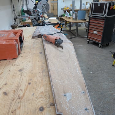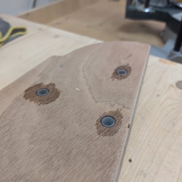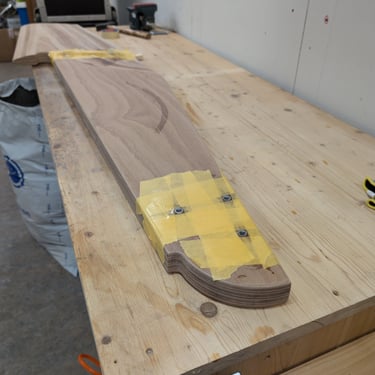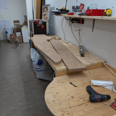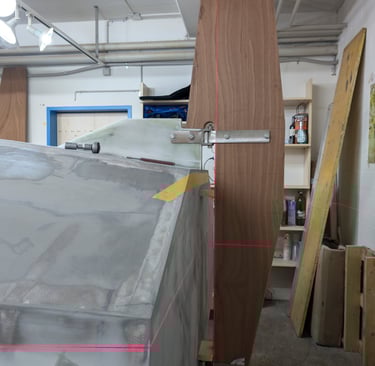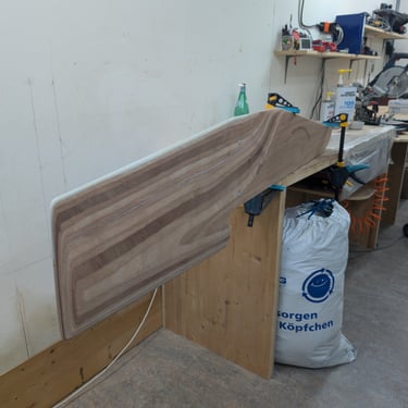 To cut out the rudder blanks, I used Joe’s rudder template. Joe, from Hull 165, is building with a kit and kindly provided me with his template—thanks, Joe! 😊 I traced the shape of the rudder onto four 10mm mahogany plywood sheets and rough-cut them using my track saw. I then routed a 10cm wide groove in the center pieces to accommodate some fiberglass for the trailing edge. During the glue-up, I laminated a roughly 4mm thick fiberglass band inside that groove. The entire process was done wet-on-wet. To ensure proper alignment, I used pre-drilled guide screws along the length of the rudder. Once everything had cured, I used the template again, this time tracing it with a router. I first cut the fiberglass with a Fine tool to avoid completely ruining my router bit.