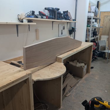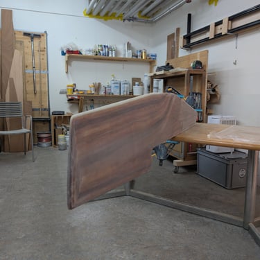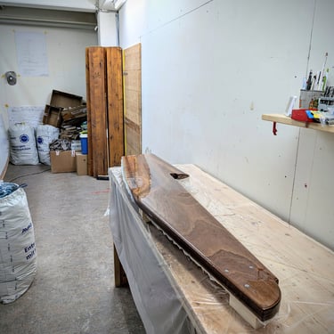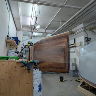 As you can see from the progress of the boat in the background, building the rudder spanned several months. I built the wooden blanks for the rudder and daggerboards quite early to break up the work and give myself some projects when I needed a break from sanding.