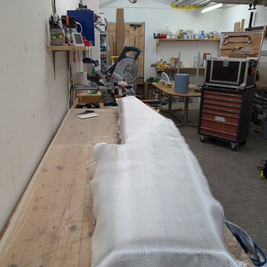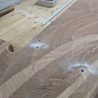 Next, I glued in the fiberglass tubing using the same process I did with the keel bolts. I taped the bottom of the holes, filled them with epoxy, and inserted the tubes. After some cleanup, I finished the profiling. For most of the profiling, I used electric and hand planes. For the top part, where the rudder shape flows into the full width, I used an angle grinder because it’s too concave for a plane. As specified in the plans, I then laminated a 600g/m² biaxial band around the bottom part. I also applied a little thickened epoxy to the entire rudder to create a better surface for lamination. Sanding and planing plywood like this results in some tear-out of the cross-grain fibers.