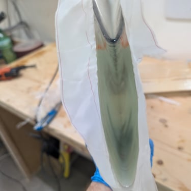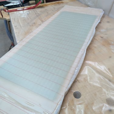 So I got started on making the fiberglass parts. The lamination schedule followed the plans, and I used 600g biaxial tape throughout. For the back piece, I laminated onto a plastic-veneered chipboard, used peel ply on both sides, and then pressed it all together with clamps. Clean and simple. The daggerboard pieces themselves were a bit trickier. I cut a cheap plastic car floor mat to size and fixed it onto the daggerboard using shrink wrap tape. Then I prepped the laminate on my workbench — again, peel ply on both sides — and laid it over the daggerboard. After that, I wrapped the whole thing.