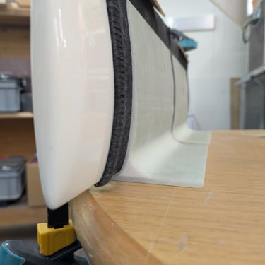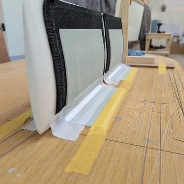 To glue two pieces together, I built a small jig to hold one of the daggerboards at a 90° angle and taped it to the table. Then I applied clear epoxy to the joint and did a small initial fillet to lock it in position. I followed up with a larger fillet and once that got tacky, I laminated over it — this time using a couple of clamps to pre-bend the workpiece, giving me higher pressure on the boards later on.