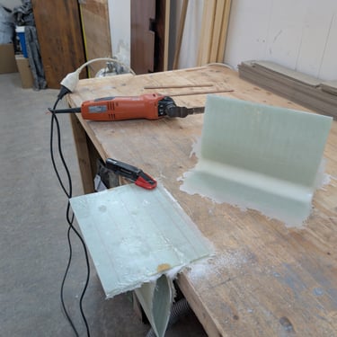 I was really happy with the results. Once everything cured, I cut the pieces to size. Cutting fiberglass needs a slow and steady hand — you don’t want to burn the resin. I used fine-toothed hardened blades to avoid ripping the strands. On the fine oscillating tool, I used a hard-metal blade, and for the jigsaw, a standard metal blade with the speed set to about a third of max and the feed to zero. I finished with 80-grit sandpaper to clean things up.