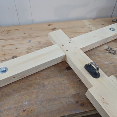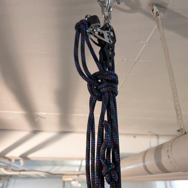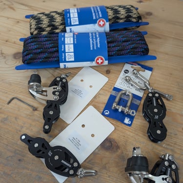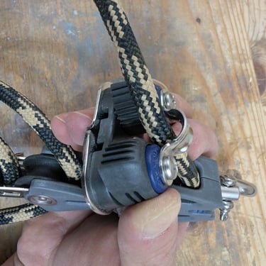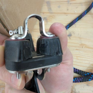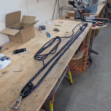 Since my boat was at its lightest—without Frame S or bunk sides installed—I estimated its weight to be no more than 500 kg, excluding the strongback. To build the pulley system, I decided to use Blueshark violin blocks from the backstay. The first three pictures show the pulley setup and the components used. The weakest link in the system was the Blueshark blocks, rated for a working load of 410 kg.