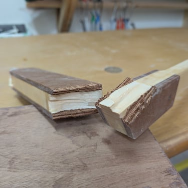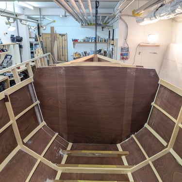 While turning the boat, the aft pulley suddenly slipped, causing the hull to drop to the floor, smashing down onto the starboard aft corner and Frame C, which instantly snapped. Thankfully, no one was seriously injured. Joe from Hull #165, who was helping, got a minor cut on his hand from a sharp wooden edge. Unfortunately, my Drifting Donkey took its first beating.